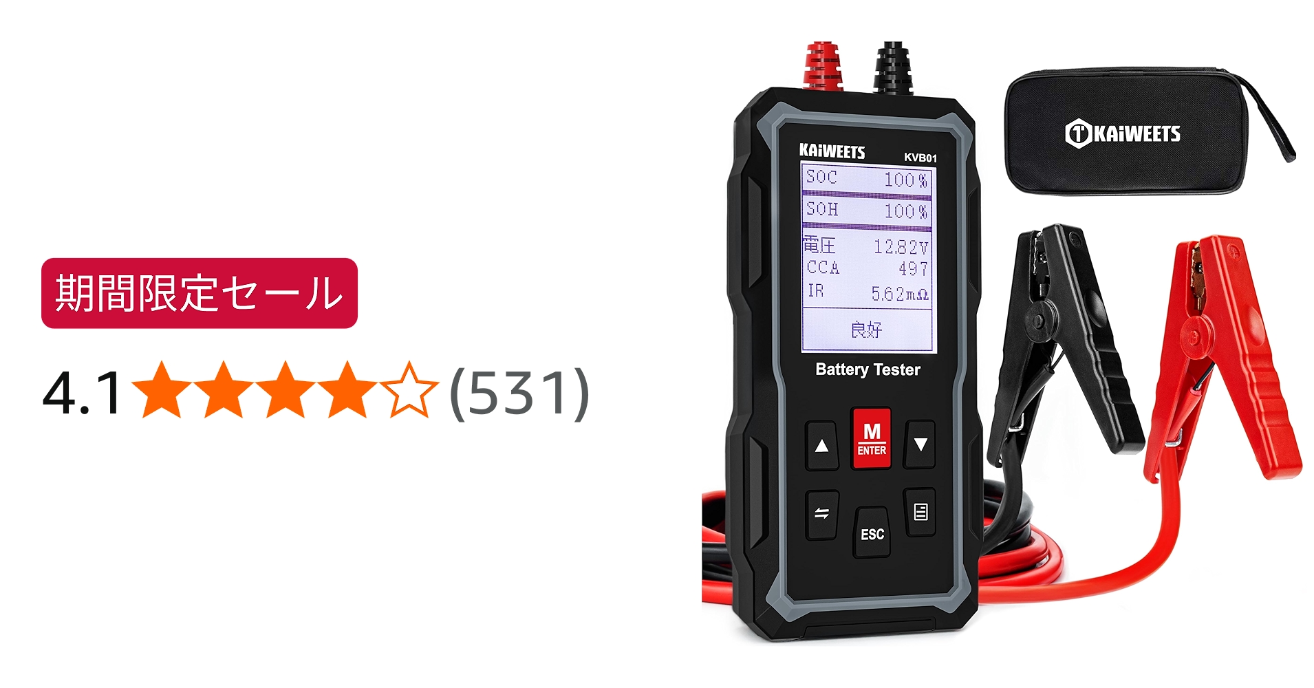 バッテリーテスターKVB02は電圧・内部抵抗・CCA・SOH・SOCなどを簡単に一括測定できる高機能バッテリーチェッカーです。